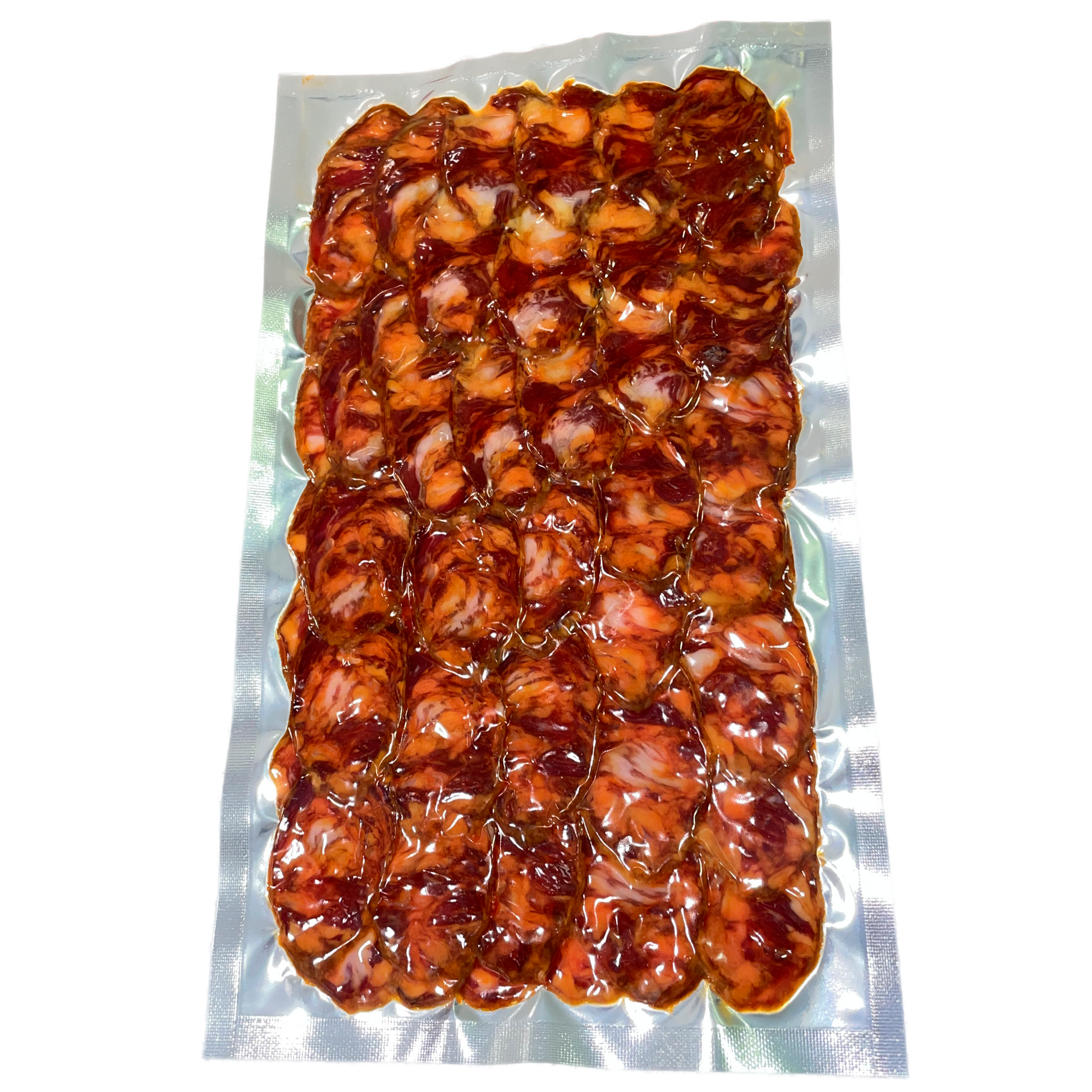 Producto obtenido de las mejores carnes procedentes de cerdos 100% ibéricos seleccionados desde su nacimiento. Pasan la primera etapa de su vida en granja, alimentándose a base de cereales naturales hasta alcanzar un peso de entre 40kg y 50kg, cuando acceden a las dehesas. En ellas disfrutan de una exquisita alimentación compuesta por la ya mencionada selección de cereales, pastos, tubérculos, raíces y bellotas, llegando a pesar entre 90kg y 100kg a primeros de octubre cuando comienza la montanera, momento en el que caen las bellotas y de las que se alimentan en exclusiva hasta alcanzar un peso aproximado de 180kg en su etapa adulta.
