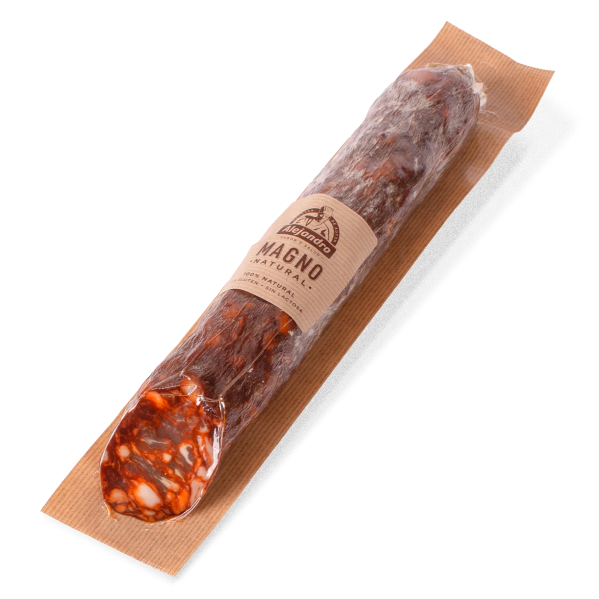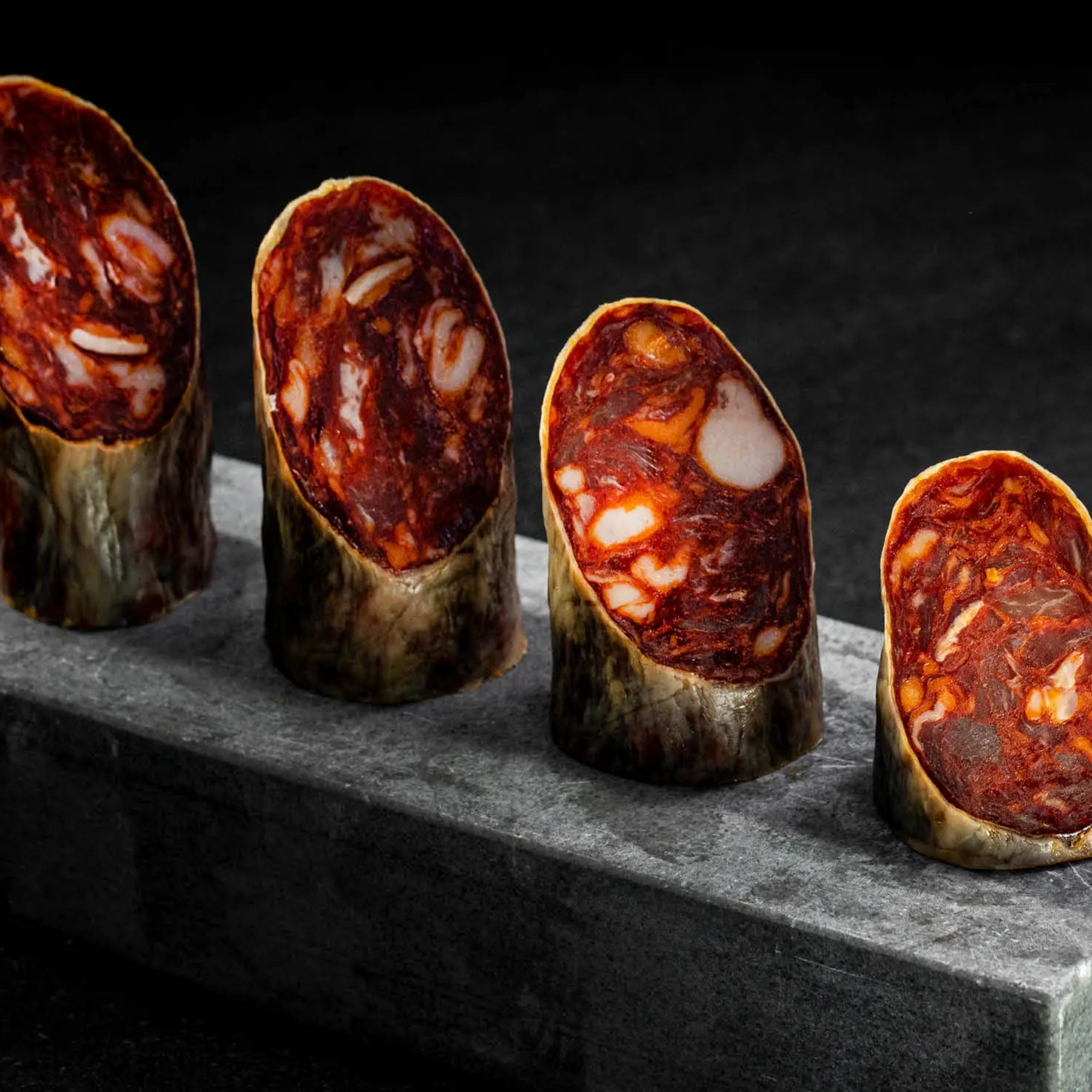Un chorizo de picado grueso con un carácter muy definido que representa el equilibrio perfecto entre sabor y aroma. En nariz, destacan los aromas ahumados y especiados del pimentón, mientras que en boca es potente, con un final corto, agradable y sin acidez.